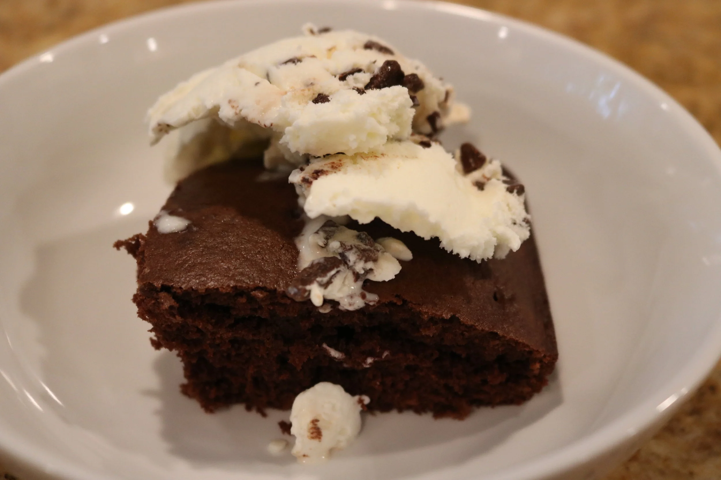 In a large mixing bowl, I added one ingredient at a time and hand-whisked it into the batter. I upgraded the cocoa to Dutch-process and the vanilla to Mexican, 35% alcohol; then I baked it for exactly 30 minutes. I discovered that mint chocolate chip ice cream made on a farm in New Hampshire worked just as well as vanilla ice cream.