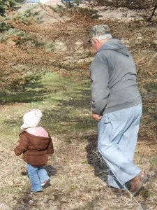 My niece on little feet that bounced over the ground. My dad in work boots that lightened as he followed her bounce. When she spotted an egg out of reach, she turned, put her arms up, and Grandpa lifted her to the egg. Her big blue eyes spoke to his soft blue eyes with an occasional, "Up Grandpa!"