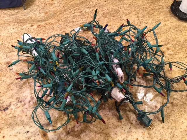 After letting the boughs loosen up for a couple days, I got out the box of lights and ornaments to put on the tree. Proud of and happy with my all-day organizing extravaganza at the end of the season last year, I had three sets of 200 lights ready to go. I plugged the first one it and only half the string lit. I burned my finger on one bulb in the second set. I saw no sign of light with the third set. I thought I was putting lights on the tree, but I was not.
