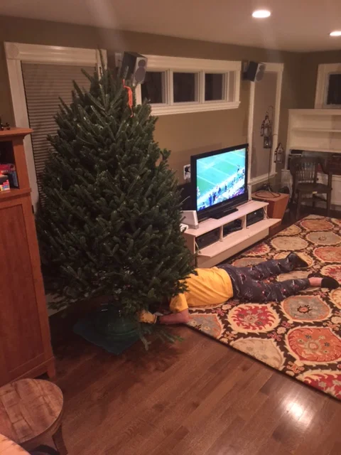 I bought the tree and asked Bill to help me get it up. He left the ball game, and we were very serious with this endeavor: me holding the tree upright and Bill tightening eight screws to hold the trunk in place. On cue, I backed up to check its vertical angle, and suddenly, it was no longer serious. The tree appeared to have landed on Bill and flattened him. And there I went with a gut-busting-gonna-pee-my-pants laugh. It was a scene out of a twisted version of The Wizard of Oz.