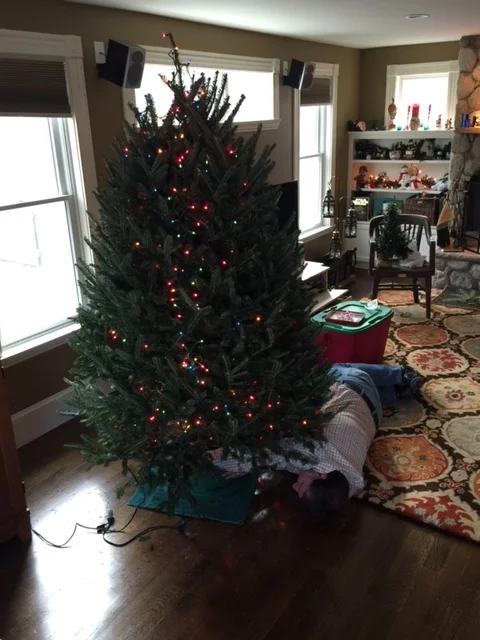 Two days later, I have new lights. As I start weaving the lights back and forth, bottom to top, I feel the tree begin to hug me. “Bill!” Bill was working at the counter, then he wasn’t working at the counter. And yet again, my funny bone was tickled and I was doing something that I wasn’t planning on doing. Bill was not as entertained this time when I said, “Don’t move!” Again?