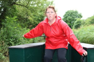 I was determined to man all aspects of this journey, including captaining the boat, steering down the canal, and operating the locks. I took the rudder the first day, within the first hour. I felt if I didn’t do it soon, I would lose courage altogether. Hence, this action shot in my new red rain coat.