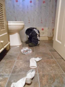 Swinging through the hallway to go to the basement, I caught a glance of strange shadows in the bathroom. The light was off and the afternoon light coming through the window was mottled. I stopped and said, "Liam?" To which there was no answer. I looked closer. I was sure he was in there. I approached the shadows. Headless Halloween story characters popped into my head. The Headless Horseman. But what I was seeing... just legs standing by the toilet. With the light on, it was clear my son had NOT left his legs in the bathroom. Only his sweatpants and boots... and a trail of other garments.