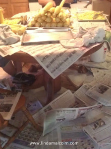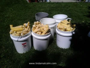 Towards the end of the afternoon, Liam walked through the kitchen. “BLAH! YUCK! What did I step in???” Ah, yes, that feeling of sweet, sticky corn milk on the bottom of your foot and the dragging of newspaper along with you as you try to walk away from it.  My “doing corn” memory and his “doing corn” experience were now complete!