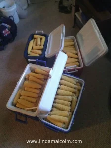 Four coolers of corn on the cob equal 100 pints of corn kernels for the freezer. Once we had lined the coolers up in the dining room, Dad’s job had ended for the time being, and Mom took over.