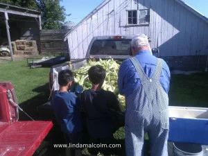 What will you do or did you do on your 70th birthday? At dusk on the eve of Dad’s 70th birthday, Will, Liam and I were helping Dad pick sweet corn.  We would be “doing corn” the next day, on his birthday.  In the corn patch, which was probably 100 yards long and 20 rows deep, Dad picked corn and filled 5-gallon buckets while I couriered full buckets to the Chevy S-10 and emptied them into the truck-bed.