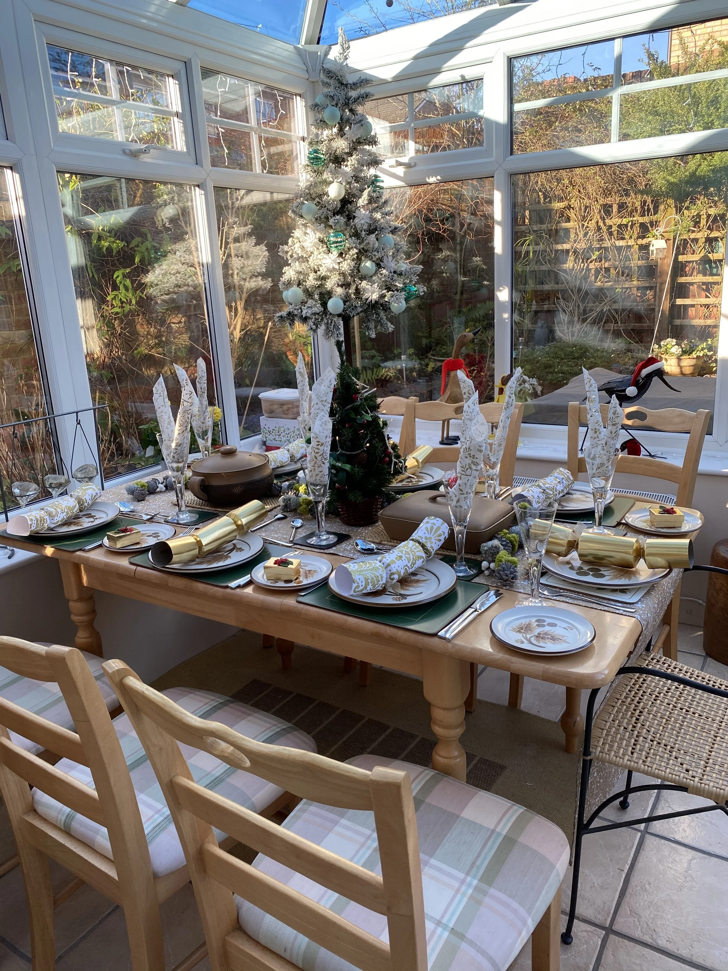 The Christmas table preset in daylight when the garden and blue sky drew the eye outside. In the evening, the twinkle of lights and candles created a coziness inside the conservatory.