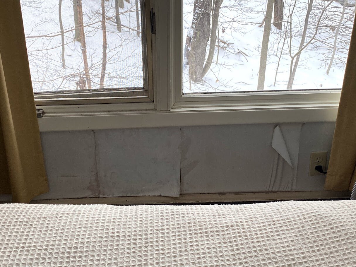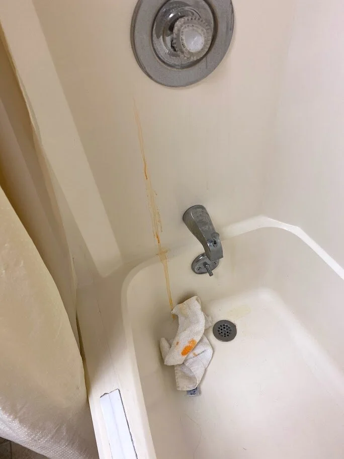 Once unpacked, I decided to watch TV before going to bed.  As I sat down, the creaking springs from the pull-out sofa stuffed inside made me jump.  I felt like I was atop an arrow firmly strung and ready to be launched from the bow.  That night, with the radiator heat spewing forth, I slept with the window six inches open; by morning it was a comfortable 66 degrees in the bedroom.  A hot shower sounded good.  Until I pulled back the shower curtain to see a washcloth under the faucet. The cloth was covered in neon orange goo.  The trail of orange led to the shampoo dispenser anchored above on the shower wall. The washcloth was the apparent “fix” to this leak.  I threw the cloth out and ran the water.  Six inches of the much-too-long shower curtain floated on the bottom of the tub.  Was I any cleaner when I stepped out?